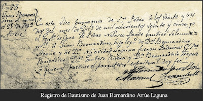 También un 25 de mayo pero de 1891 nacía en La Plata, Buenos Aires, Bernardino Arrúe Árraga, ciudad que acunó a tantos retoños del linaje. Hijo de Federico Evangelista Arrúe Areta, quien nace en Montevideo en 1860 y toma la mano en matrimonio el 20 de octubre de 1887 en la Iglesia San Ponciano de la Ciudad de La Plata de la señorita, María Celia del Corazón de Jesús Árraga Gómez, nacida en Montevideo en 1862.